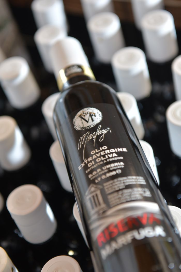 Das native Olivenöl extra g.U. Umbrien RISERVA MARFUGA wird aus ausgewählten Oliven (Moraiolo und Frantoio) gewonnen, die ausschließlich von Hand in den Olivenhainen des Gebiets von Campello sul Clitunno und Trevi geerntet werden. Die Verarbeitung der Oliven erfolgt in der familieneigenen Mühle, etwas vor dem richtigen Reifegrad. Die chemischen und organoleptischen Eigenschaften, die das Produkt auszeichnen, sind: eine intensive grüne Farbe, ein frischer, krautiger Duft mit dominanten Noten von Artischocke und Distel; der Geschmack ist reichhaltig, mit einer ausgewogenen bitteren und würzigen Note und einer großen Komplexität von pflanzlichen Düften mit Aromen von grünen Mandeln am Ende.