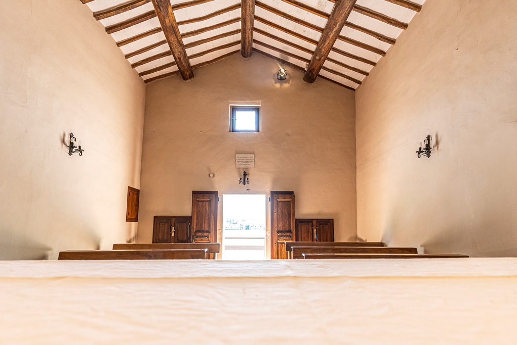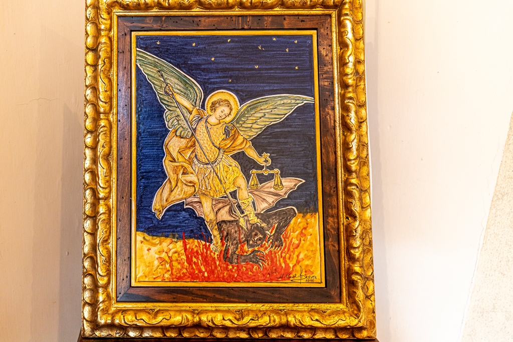 The majesty is kept in a small church plastered in white, with three small windows and a majolica with the Madonna and Child placed above the front door.