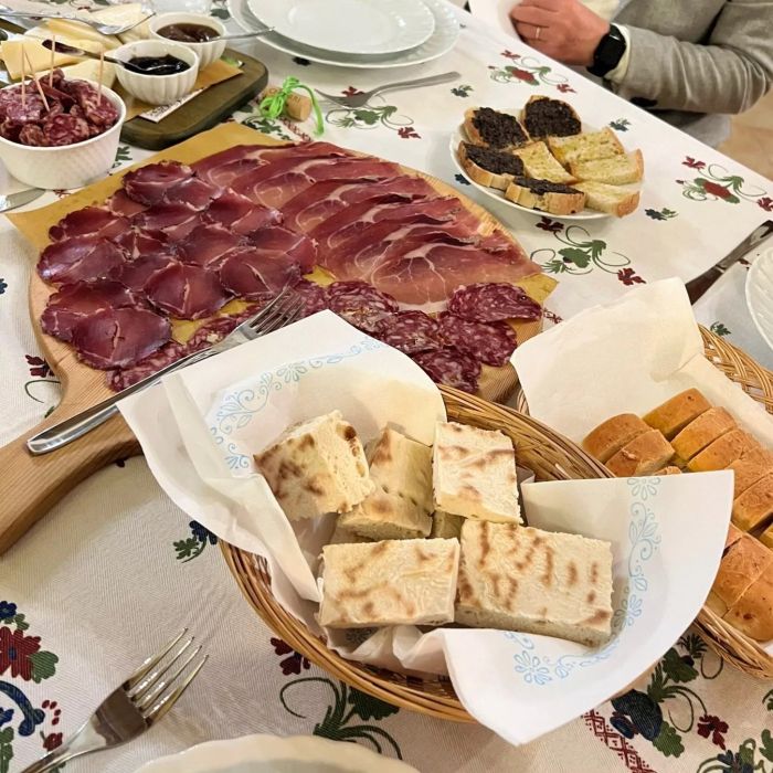 Accompagnements : Premiers plats avec des sauces à base de viande, fromage de brebis moyennement affiné, rôti de porc, plat typique de la région : torta al testo avec des saucisses.