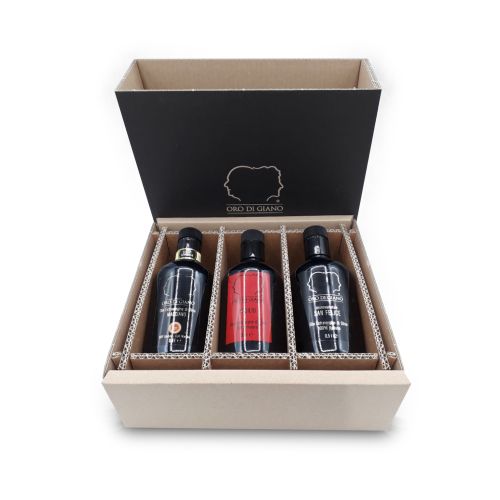 An elegant gift box with three 0.5 L bottles of our extra virgin olive oils: Macciano DOP UMBRIA Colli Martani, Basilio, Monovarietale San Felice.
