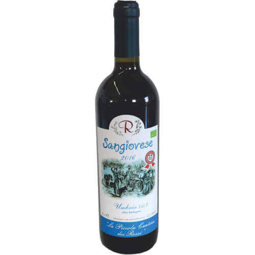 Sangiovese Umbria IGT Natural Organic. Raisins cueillis à la main, vin non filtré fermenté spontanément avec des levures indigènes.