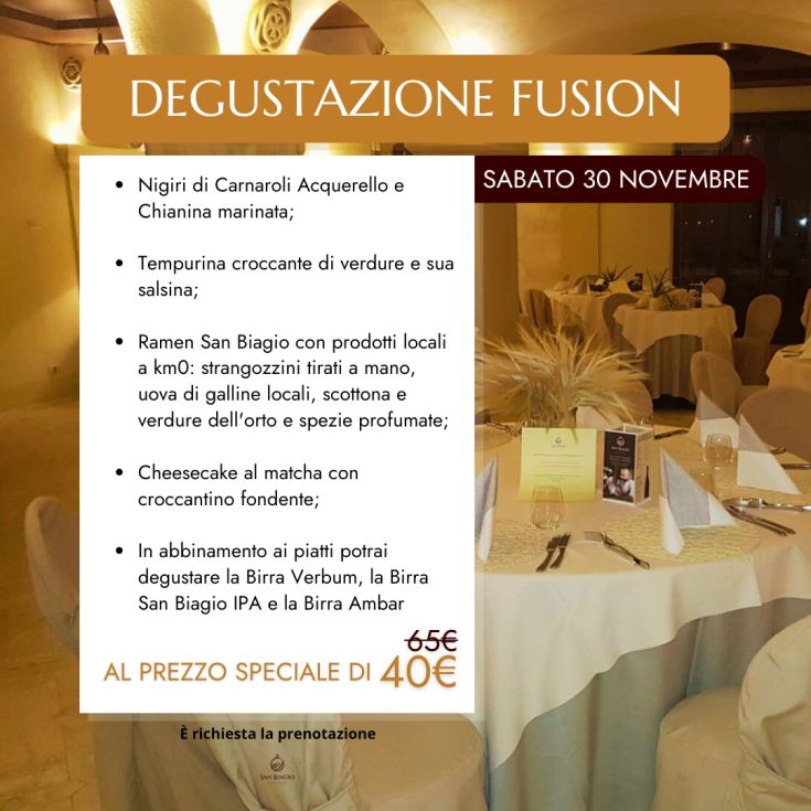For the occasion, we have reserved a special price: only 40€ instead of 65€!The Fusion Menu: Nigiri of Carnaroli Acquerello and marinated Chianina Tempurina crispy vegetables and its sauce Ramen San Biagio with km0 ingredients: handmade strangozzini, fresh eggs, rump steak and vegetables from the garden Matcha cheesecake with melting croccantino Each course will be accompanied by the Monastery's craft beers: Verbum, IPA and Ambar. Don't miss this gastronomic experience. Immerse yourself in an evening of flavours, fragrances and traditions. Hurry, places are limited!