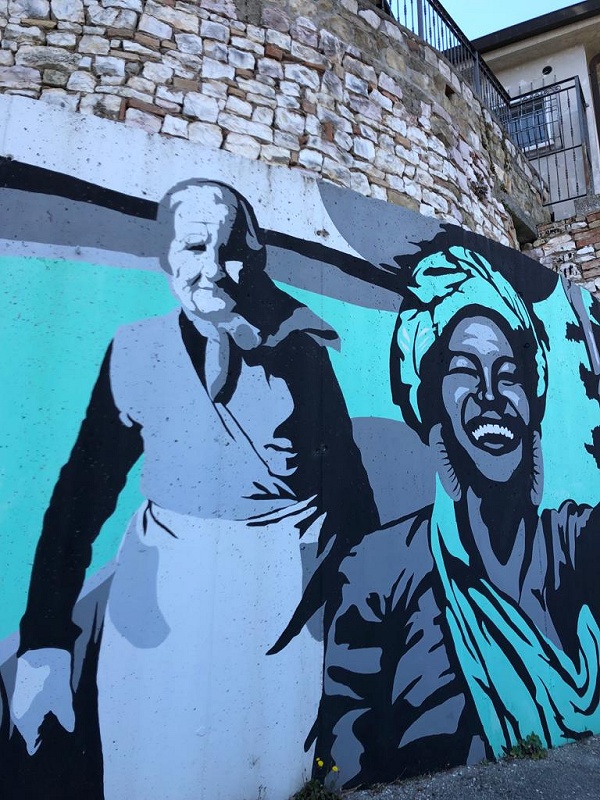 On the wall of the public parking lot in Viale Marconi, a modern mural can be seen entitled, “Mother Nature”.  A visually striking work of street art created by a group of local artists, the mural, is painted brightly in two halves divided by the central face of a crying woman- Mother Nature in depiction.  On her left side is a family at the table with skulls as faces.  Adjacent, a farmer walks by with a gas mask, against the background of burnt hills and a building with the classic undulating shape of the asbestos roofs that are still present in large quantities in this territory.  The predominant color on this part is bright red.