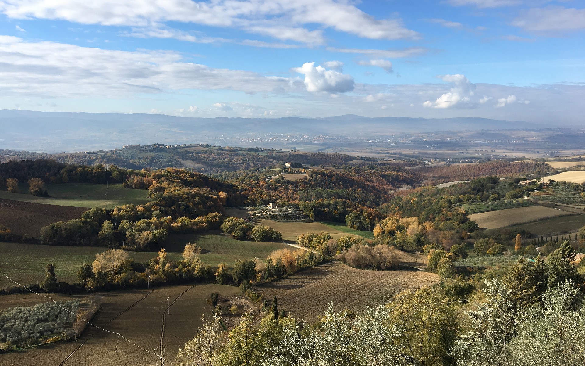 From the square, proceed to Via della Fiera and then take Viale Marconi, following towards Via dell’Abbazia if continuing on foot, or Viale Marconi if proceeding by bike.  Next, take Via di Collazzone downhill, where after about 500 meters, a left turn puts you into the woods on a dirt path.  From this descent, a wide view is offered, overlooking the small villages of San Terenziano, Grutti, Marcellano, and the hamlets of Gualdo Cattaneo.