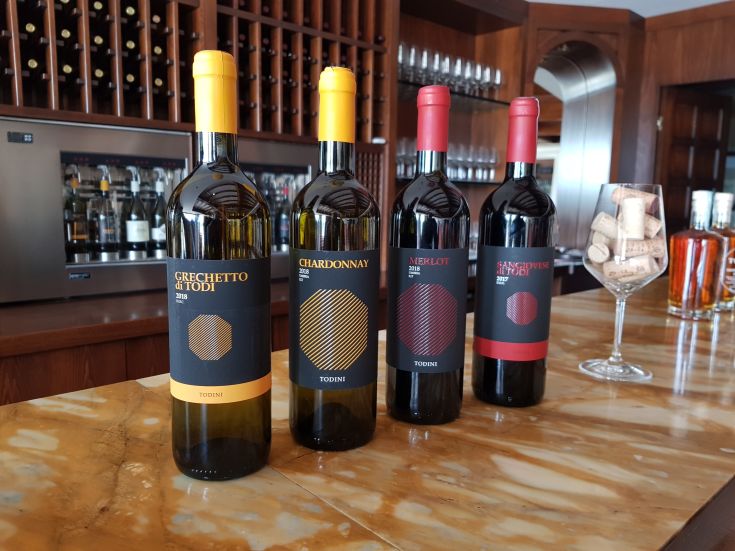 Le forfait comprend une dégustation de vins de la gamme traditionnelle de Todini (Grechetto di Todi, Chardonnay, Sangiovese di Todi, Merlot) avec un plateau de produits typiques, ainsi qu'une visite guidée de la cave et des vignobles.