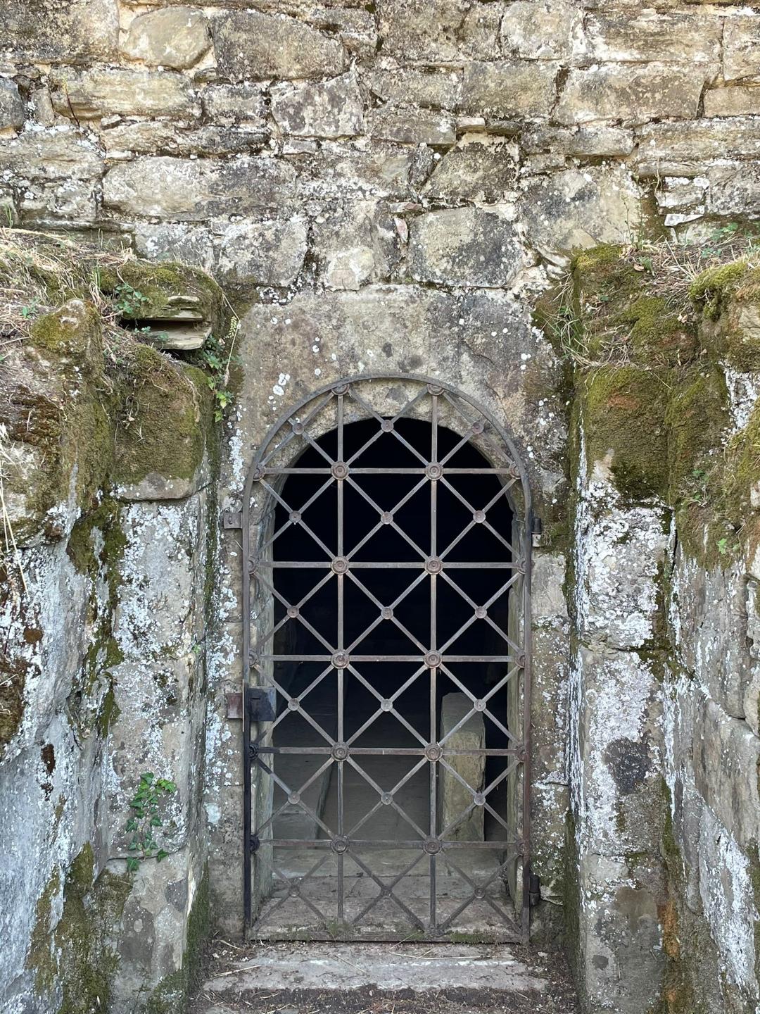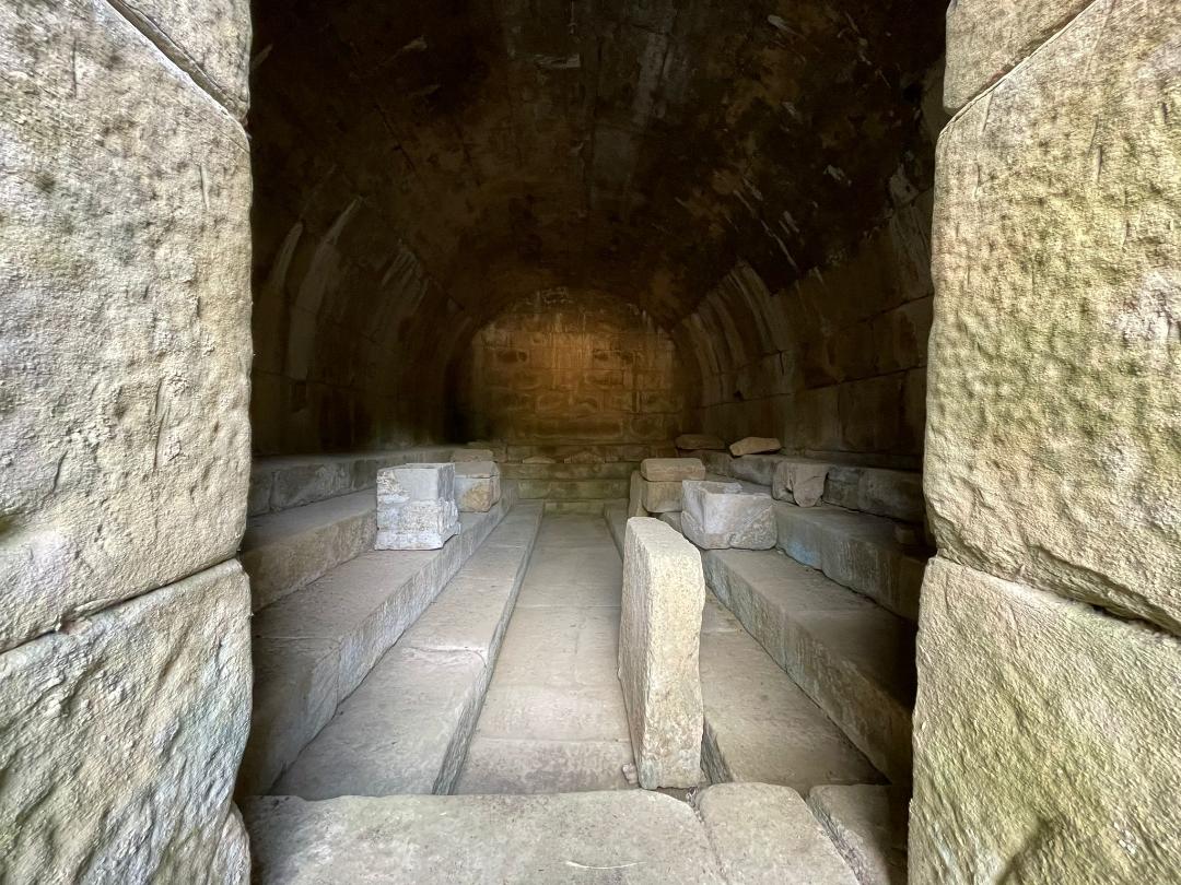 Un breve corridoio a cielo aperto (dromos) conduce alla porta, in origine costituita da due lastroni di travertino muniti di cardini, due gradini, in gran parte originari, consentono quindi di accedere alla camera sepolcrale. L’accesso è a tutto sesto con un alto architrave arcuato e dal profilo irregolare. Oltrepassato questo si entra in un unico ambiente la cui copertura è costituita da una volta a botte, realizzata con blocchi di pietra regolari disposti in filari nel senso della profondità della tomba, a formare un perfetto semicerchio. Immediatamente prima della soglia di ingresso è visibile un foro per il deflusso delle acque, un altro, corrispondente, è nel primo lastrone del piano pavimentale. Entrambi servivano per convogliare le acque in un vano di raccolta sotterraneo, in corrispondenza dell’ingresso.